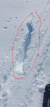 von Schnee überdeckter Spalt zwischen der Schneedecke auf der Luvseite und der